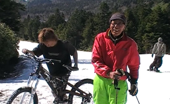 御年73歳。 妙高から来ていると言っていた爺ちゃんは、 華麗に今どきの滑りを披露する、元気一杯の お茶目な人だった。 |